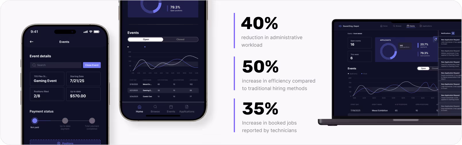 The platform reduced administrative workload for producers by 40% and increased hiring efficiency by 50%, with most roles filled within 24 hours. Technicians also saw increased job bookings and faster resolution of last-minute staffing needs.