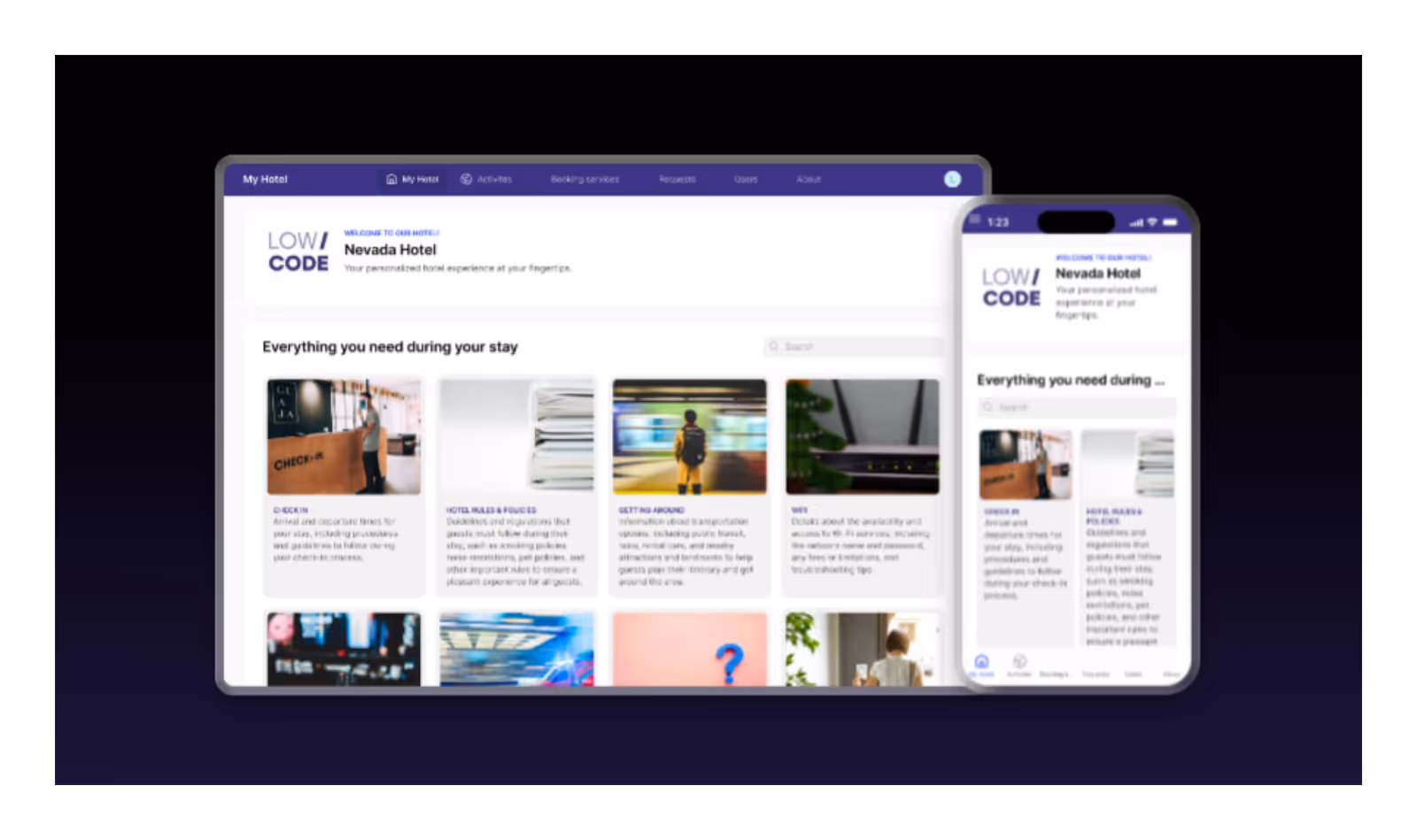 My Hotel is a comprehensive template designed to manage both guest-facing experiences and internal hotel operations. It includes reservations, check-in and check-out flows, room availability, guest requests, and service tracking. Guests can submit requests, order services, and access hotel information, while staff manage bookings, assign rooms, and monitor operations from one system.