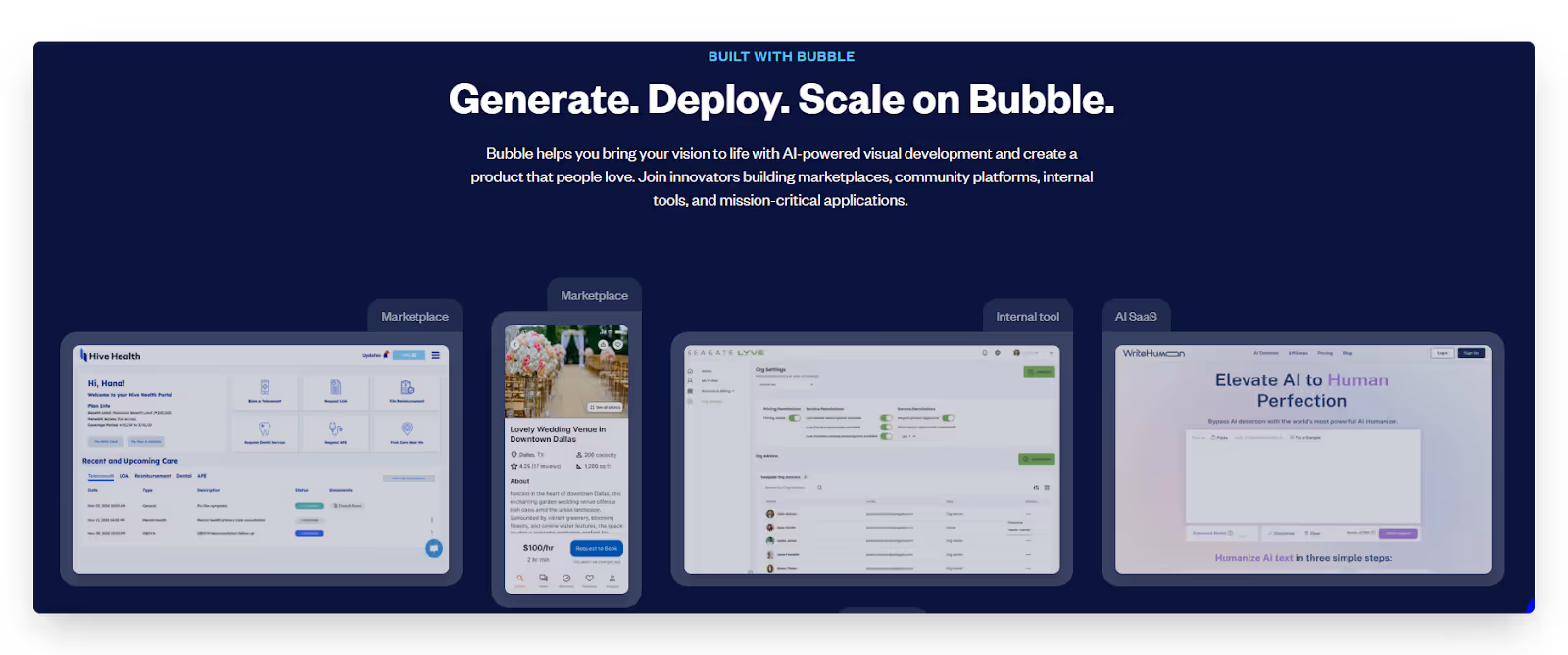 What sets Bubble apart is its strong workflow engine and backend database, ideal for handling complex business logic. Whether you’re creating user management features, payment systems, or data-heavy dashboards, Bubble provides scalability and flexibility, making it perfect for SaaS startups and enterprises alike.