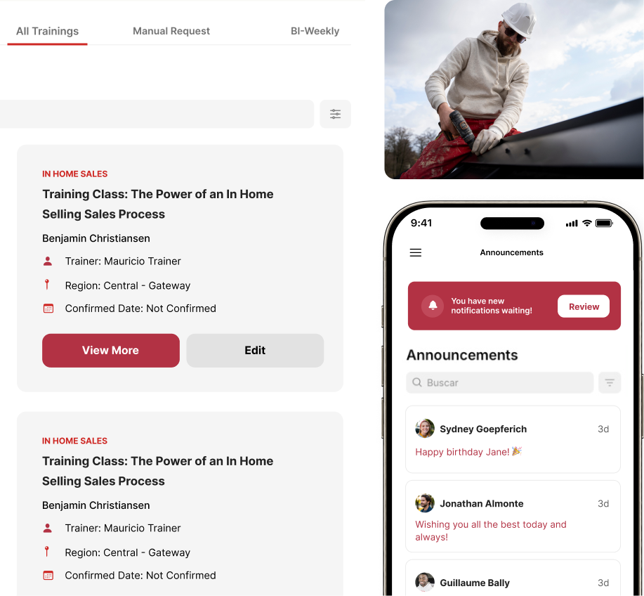 A mobile-first training management app for North America's largest roofing manufacturer. With 51 trainers handling 1,200+ annual sessions, it replaced spreadsheet workflows with smart notifications, dynamic permissions, and progress tracking — cutting admin time by 75%.